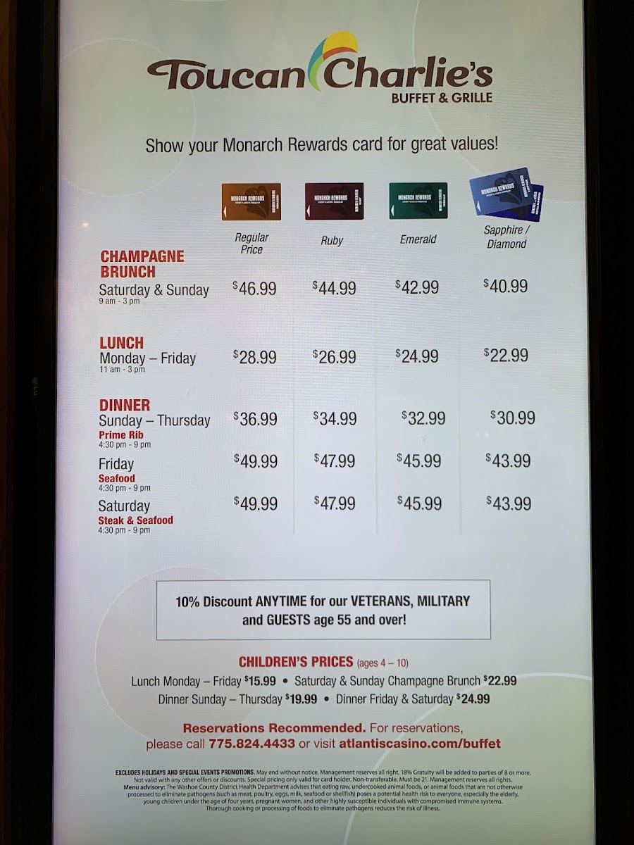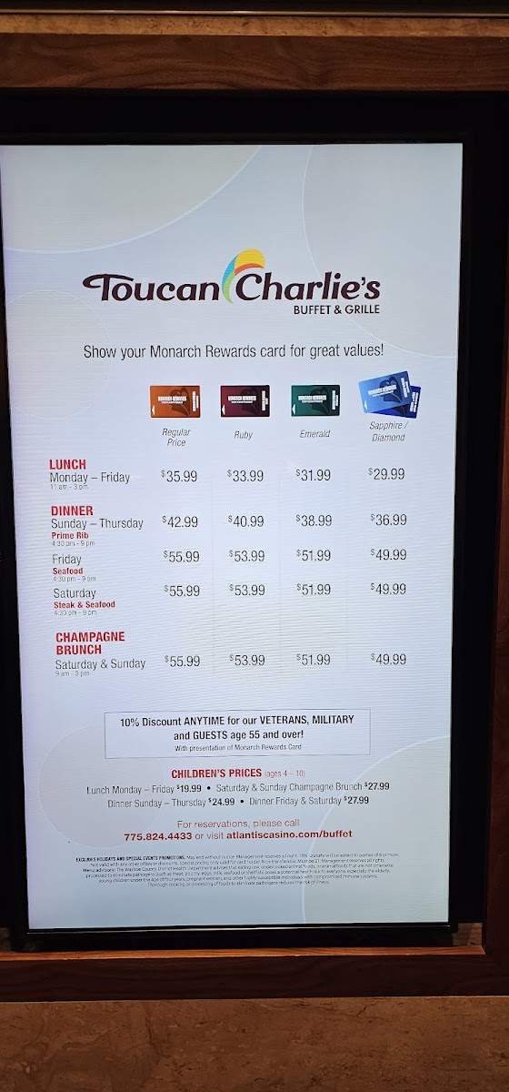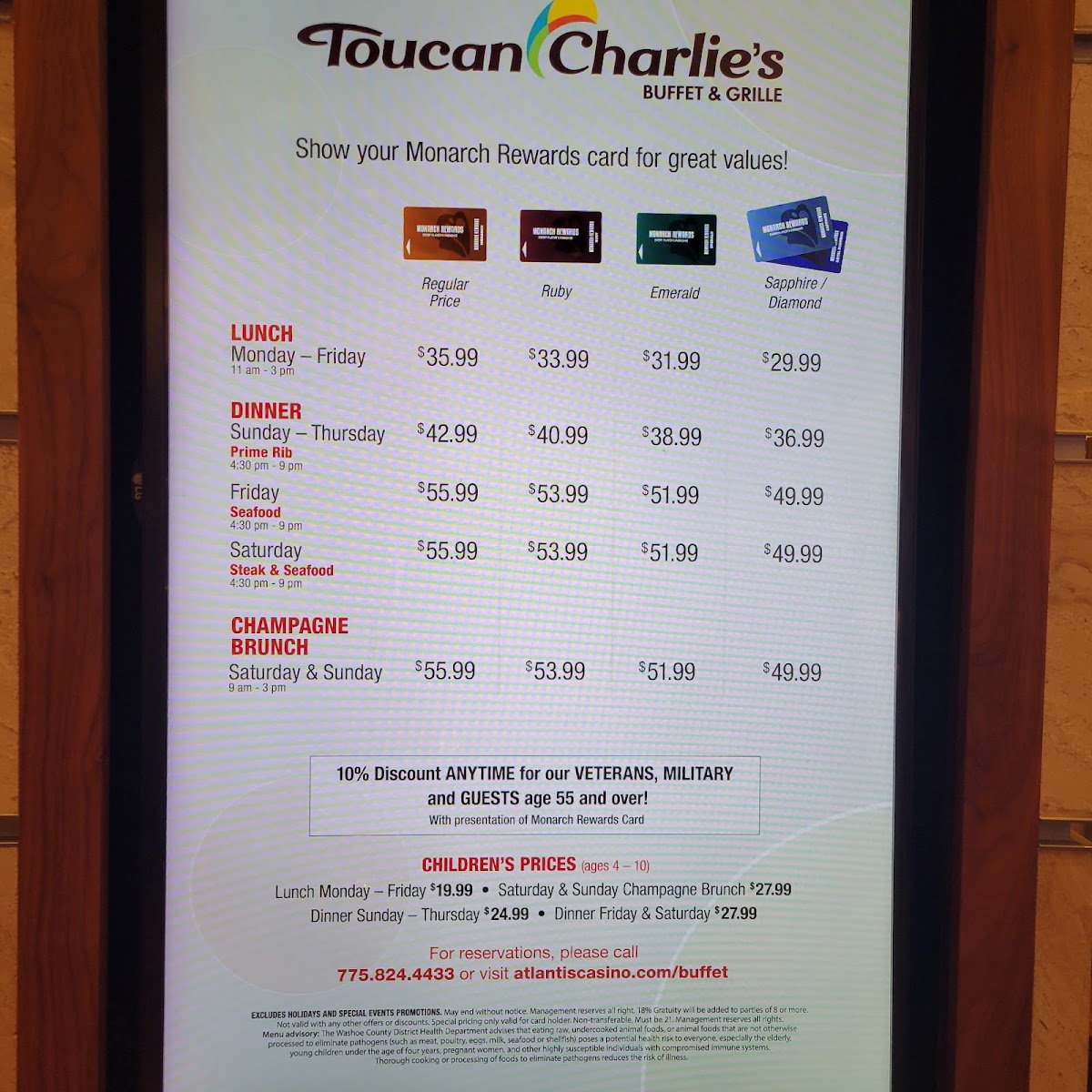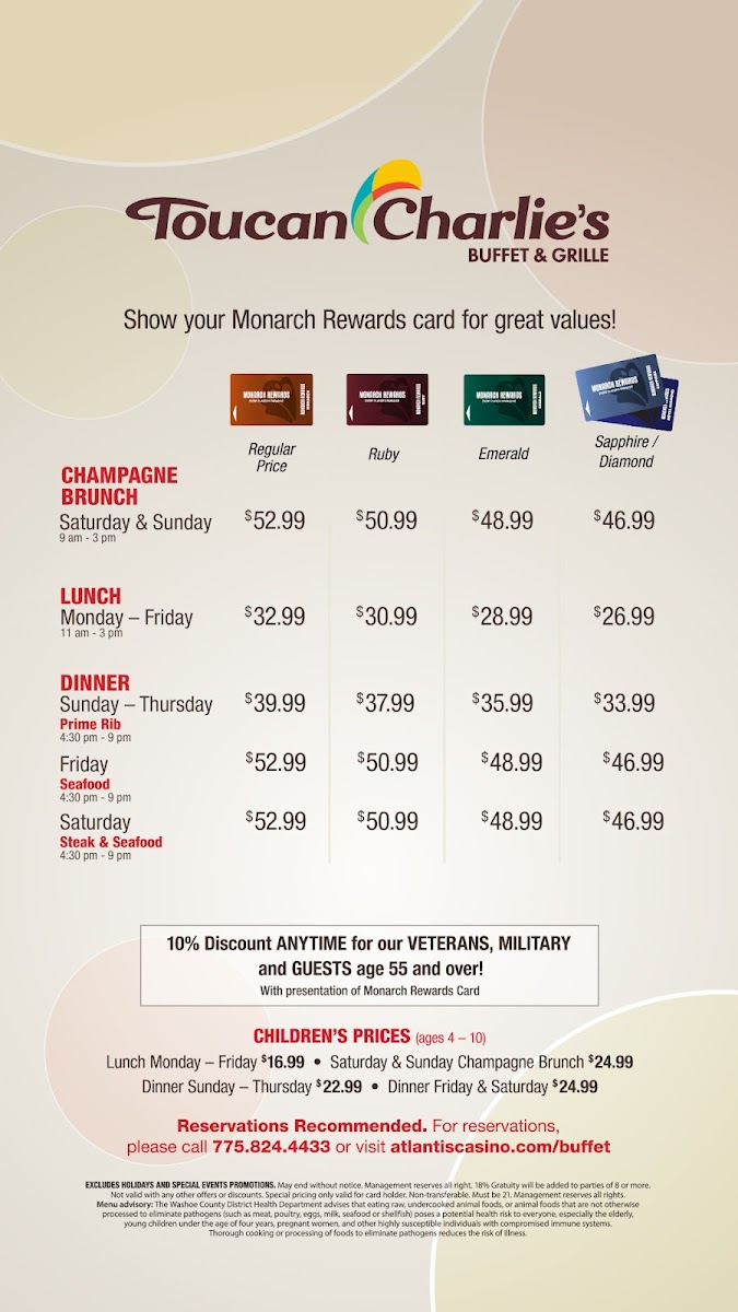 The menu at Toucan Charlie's Buffet & Grille is structured primarily around a buffet format, featuring a variety of offerings suited for lunch, dinner, and weekend champagne brunch services. Dining options include multiple buffet tiers with varied pricing for Regular/Monarch, Ruby, Emerald, and Sapphire/Diamond categories.