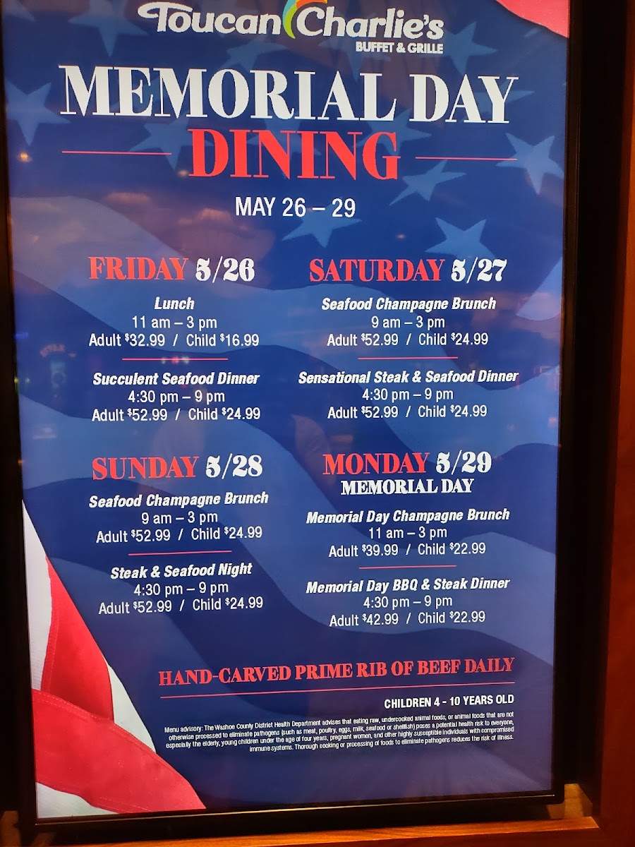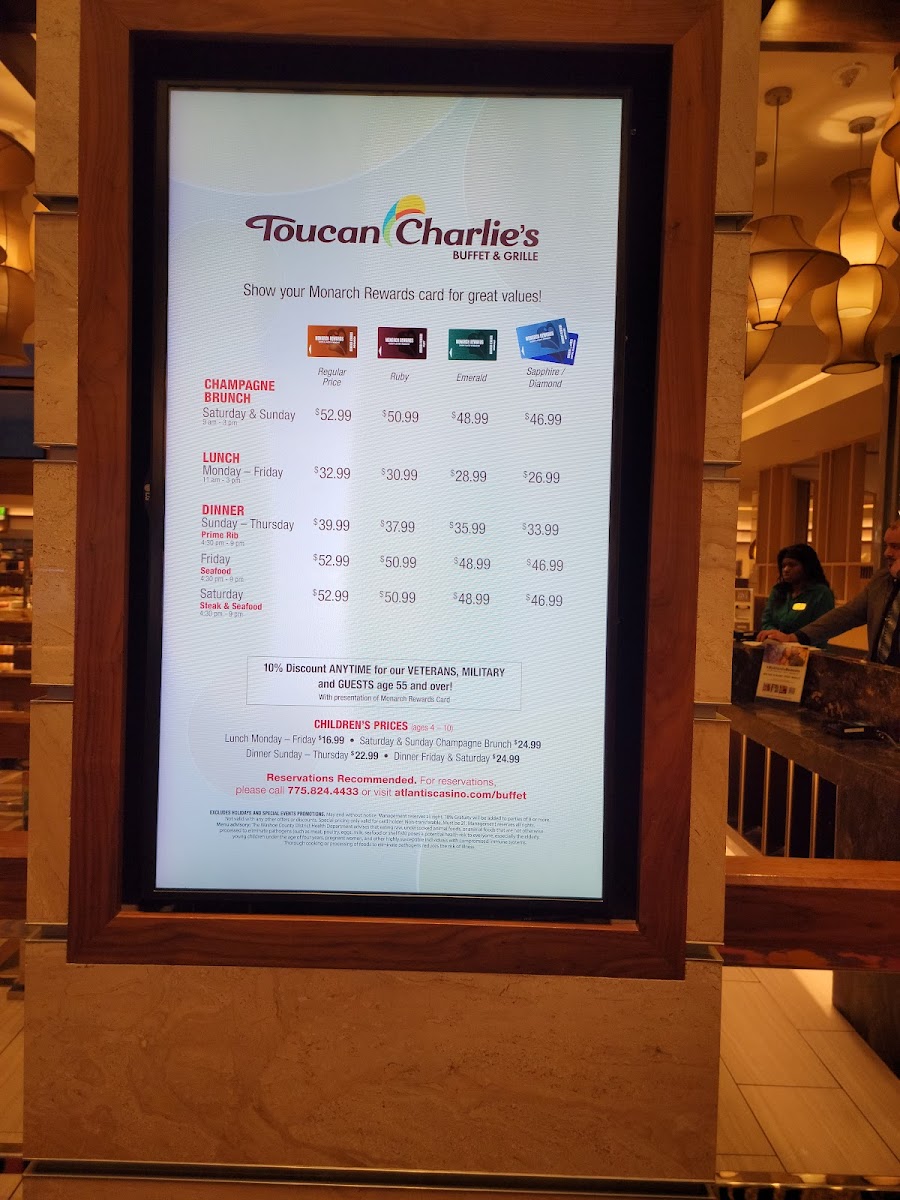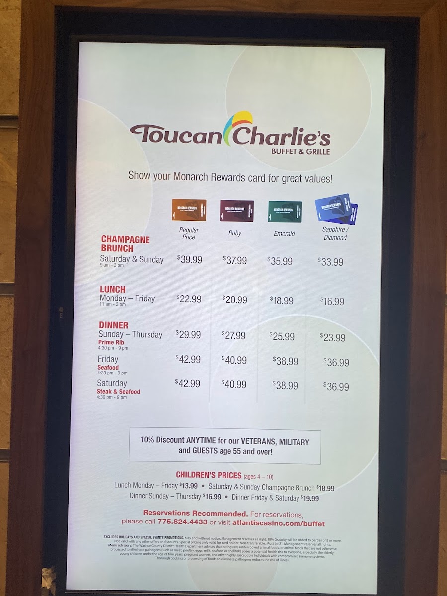 The menu at Toucan Charlie's Buffet & Grille is structured primarily around a buffet format, featuring a variety of offerings suited for lunch, dinner, and weekend champagne brunch services. Dining options include multiple buffet tiers with varied pricing for Regular/Monarch, Ruby, Emerald, and Sapphire/Diamond categories.